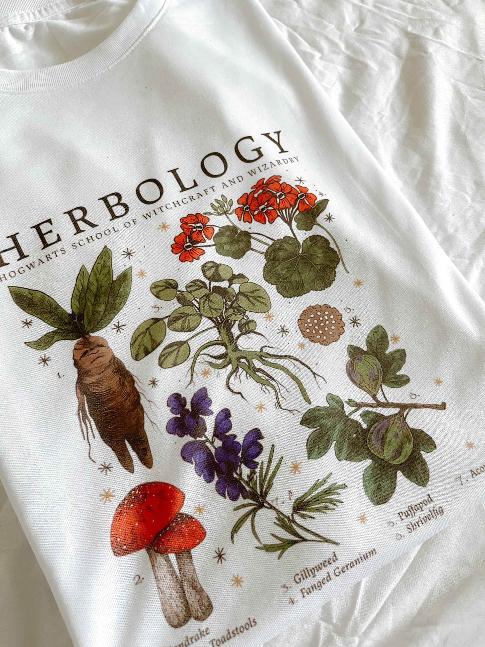 Channel your inner Hogwarts botanist with this Herbology-themed white T-shirt/jumper, inspired by the enchanting world of Harry Potter! Perfect for plant lovers, witches, wizards, and magical minds alike, this tee combines a clean, minimalist style with subtle wizarding world flair.