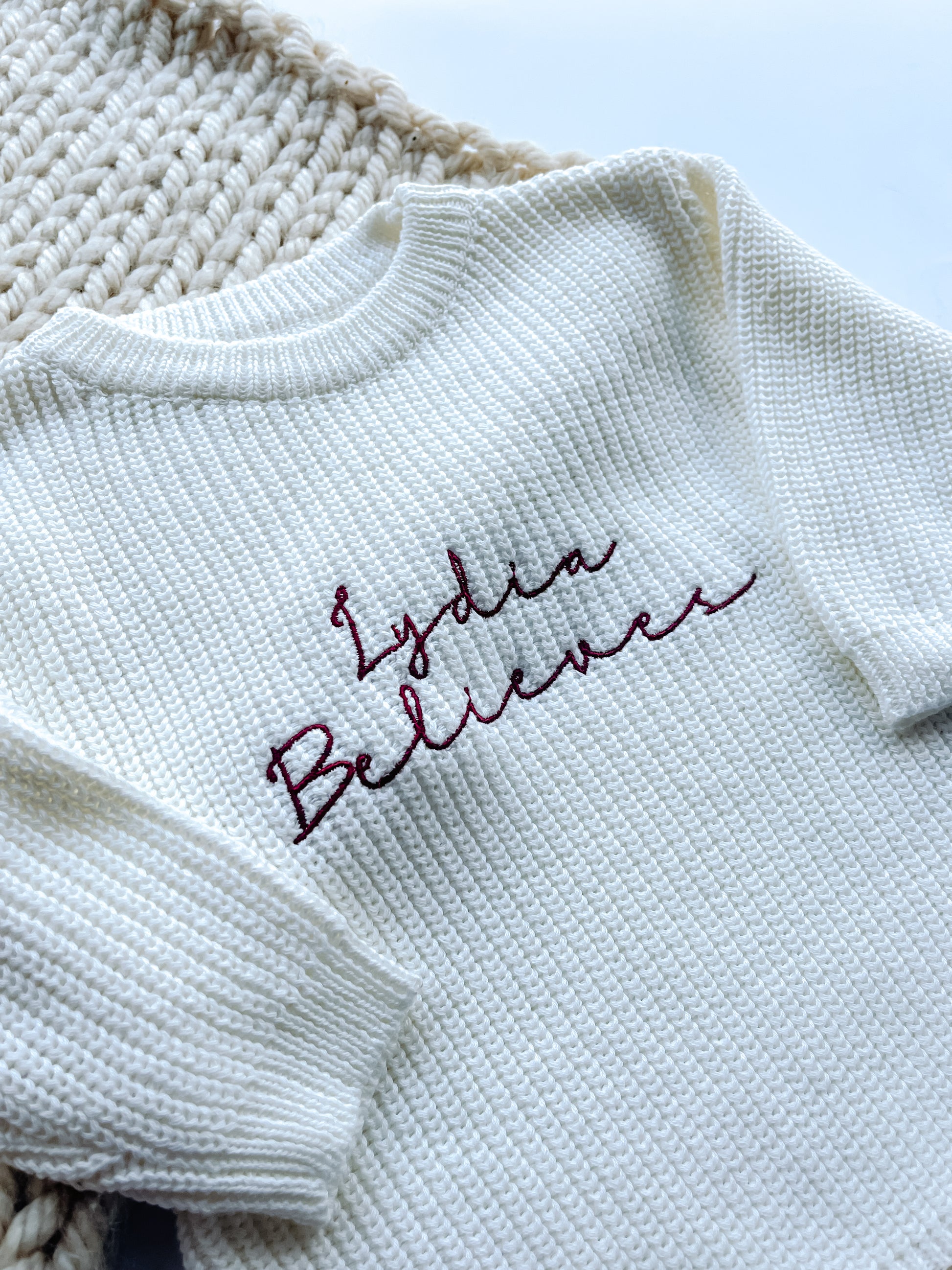 Personalised Baby Christmas Romper – “Name Believes” Embroidered Knitted Outfit