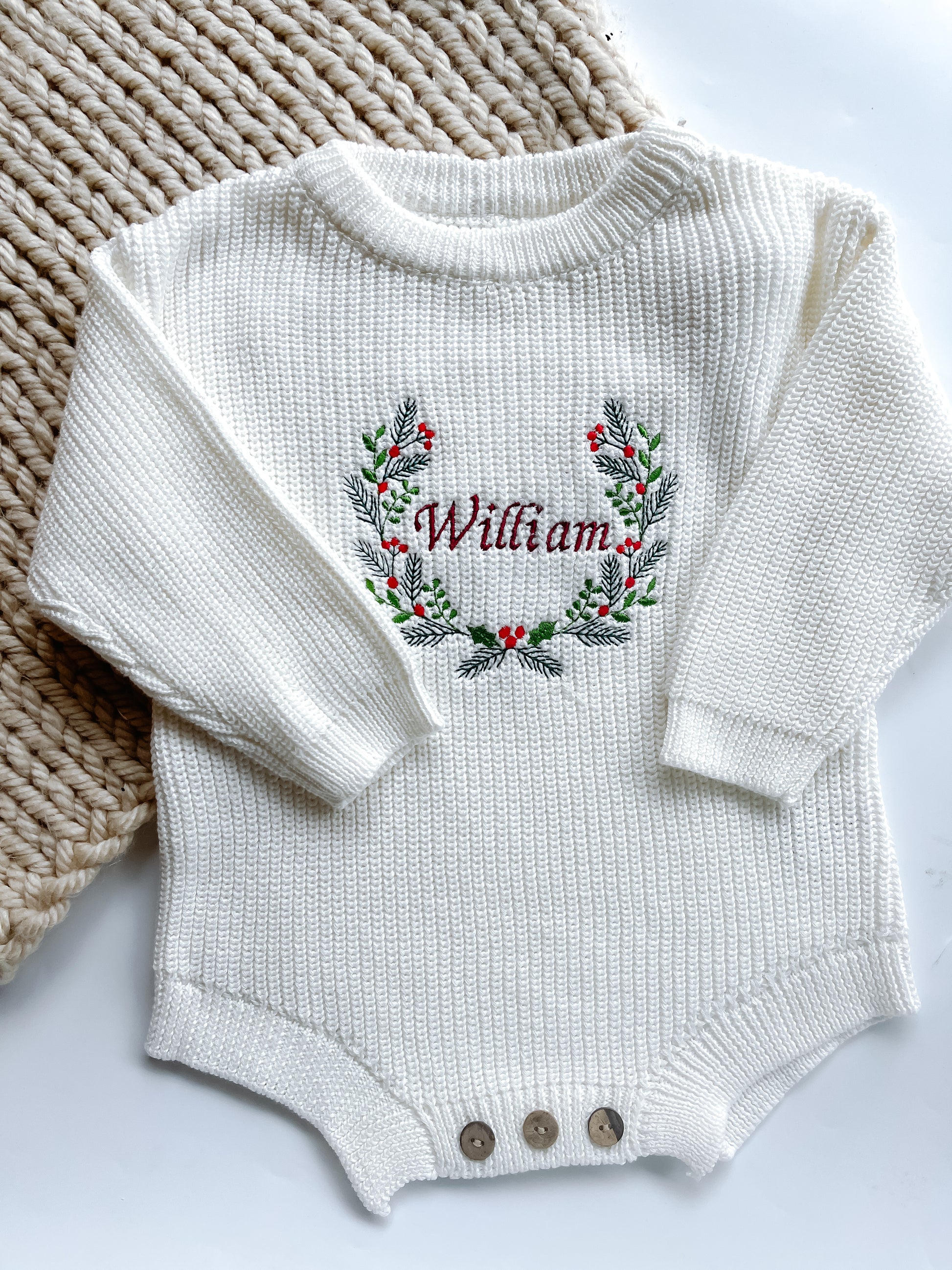 Personalised classic Baby Christmas wreath Romper – Embroidered Knitted Christmas Outfit